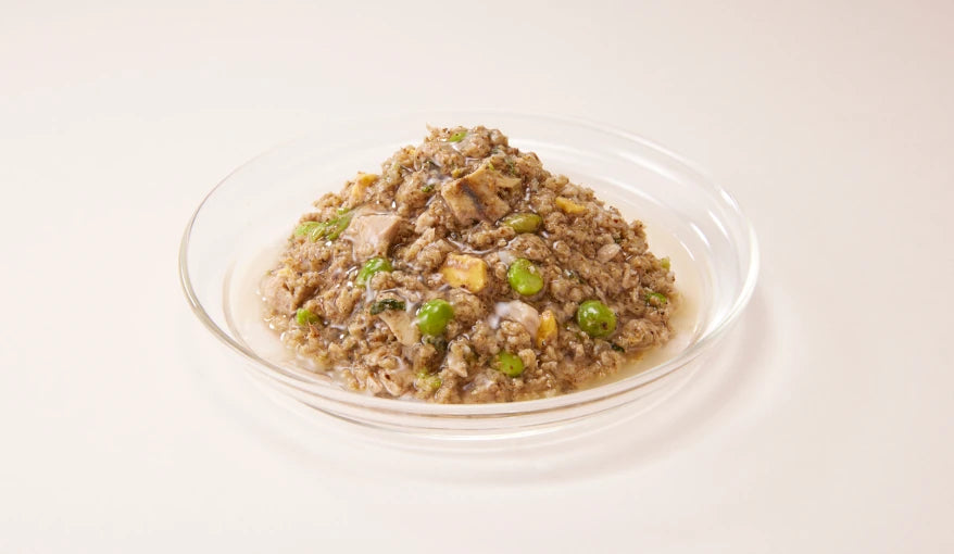 鶏もも肉、サーモン、鶏胸肉、チキンオイル、グリーンピース、鶏レバー、鶏ハツ、鶏卵、ビール酵母、ゼラチン、鰹節エキス、小松菜、鰹節粉末、白胡麻、煮干し、粉寒天、乾燥昆布、ミネラル類(Ca,Fe,Zn,Mn,Cu)、ビタミン類(コリン、ビタミンE)