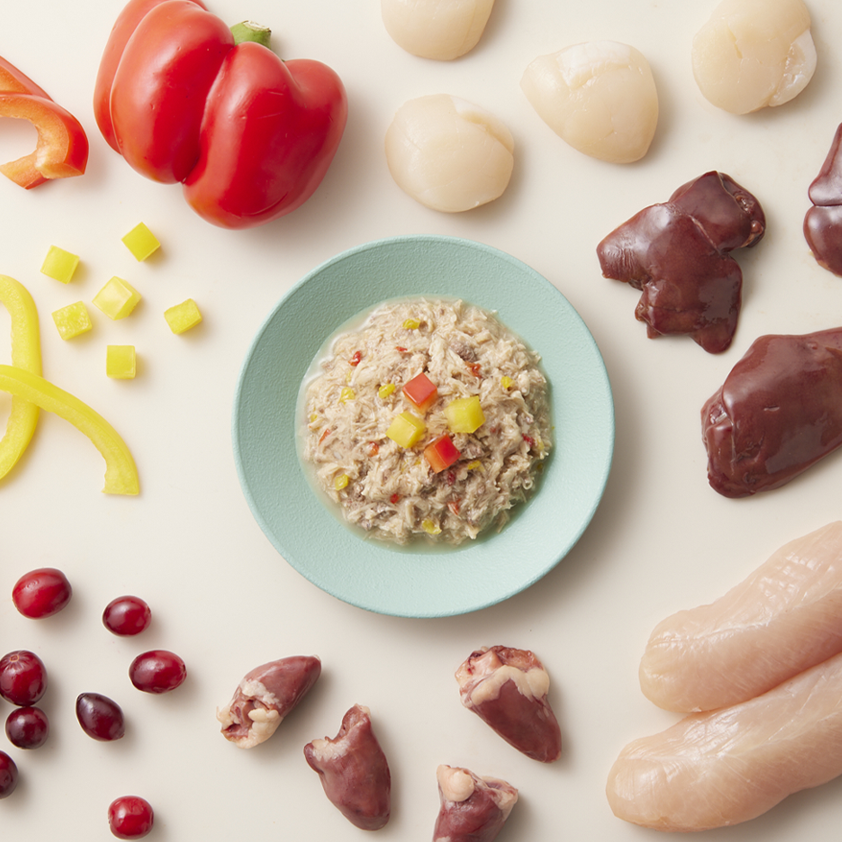 毎日のごはんで、お口の健康習慣を。新鮮な鶏肉・レバー・ハツに、クランベリーやパプリカを合わせた彩り豊かな味わい。天然海藻抽出物アスコフィランと乳酸菌KT-11が口内環境を健やかに保ちます。
