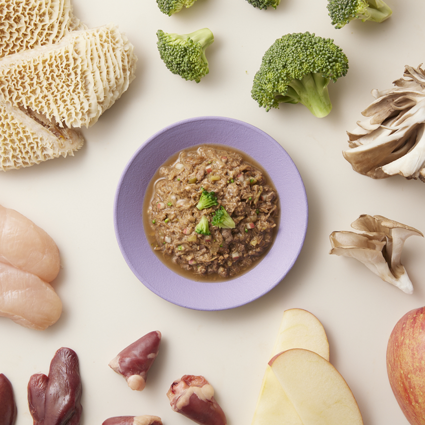 国産の鶏胸肉、レバー、ハツをふんだんに使用。ねこが喜ぶ食感に仕上げました。