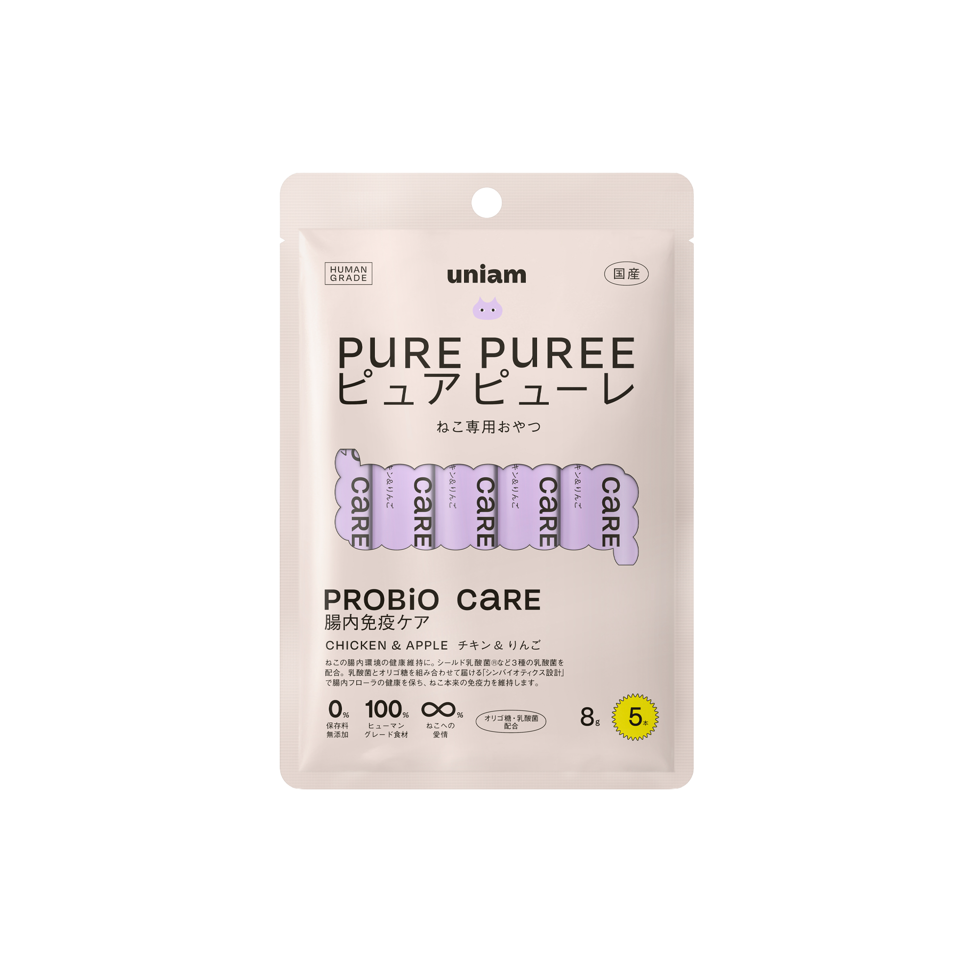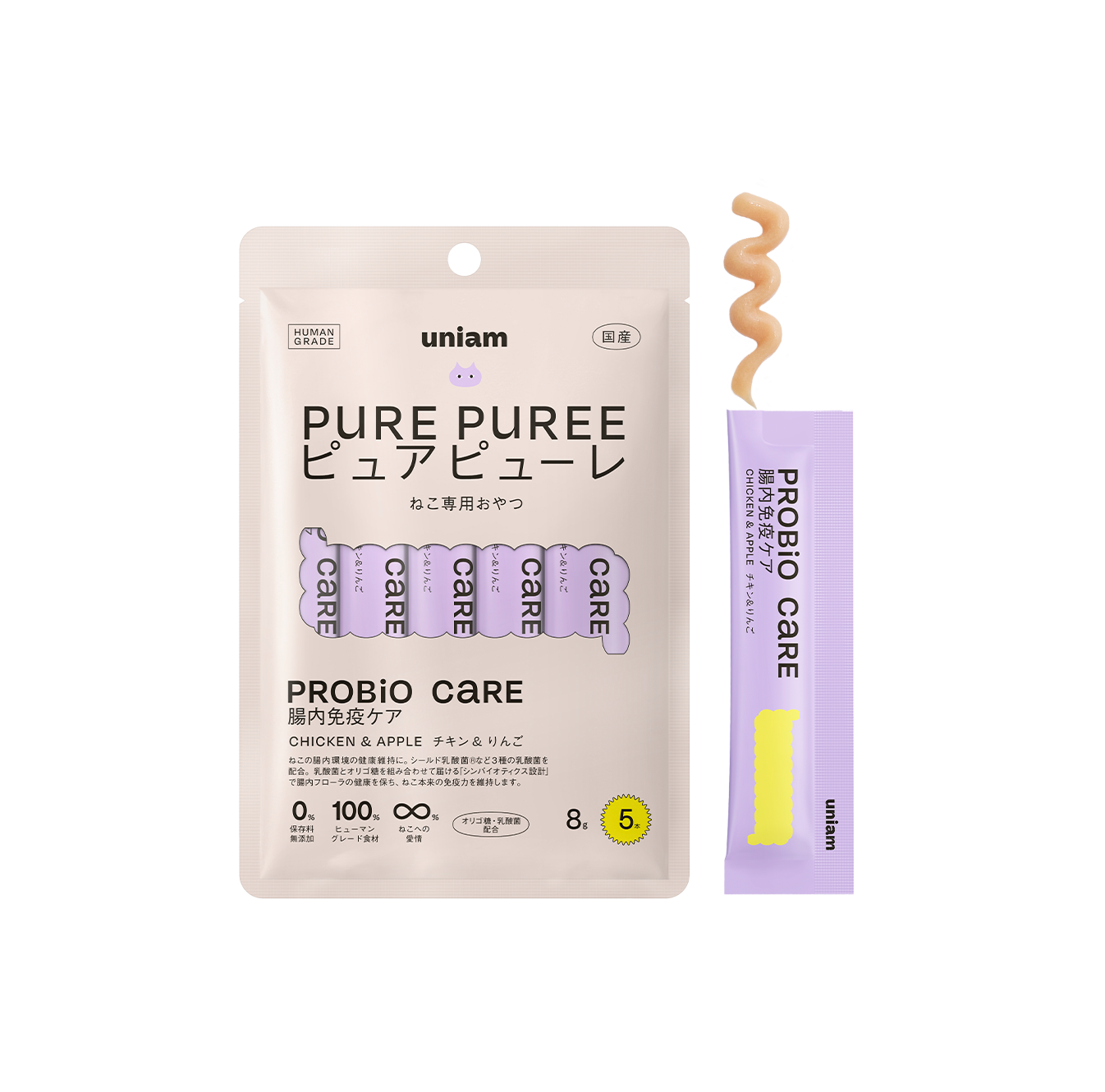 鶏肉(胸肉、レバー、ハツ)、米粉、りんごピューレ、ホタテエキス粉末、チキンエキス、はちみつ、フラクトオリゴ糖、フィッシュオイル、乳酸菌(シールド乳酸菌®︎)、有胞子性乳酸菌、乳酸菌(ビフィズス菌)、寒天