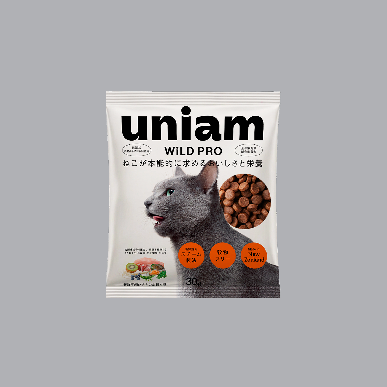 ストレスフリーな大地で育った新鮮平飼いチキンを贅沢に使用。ニュージーランド産のタウリン豊富な緑イ貝、ブルーベリー、キウイフルーツなど自然の栄養を、そのままぎゅっと一粒に。 最新のスチーム製法で、栄養とうまみを凝縮した、ねこの本能が求める新プレミアムフード。